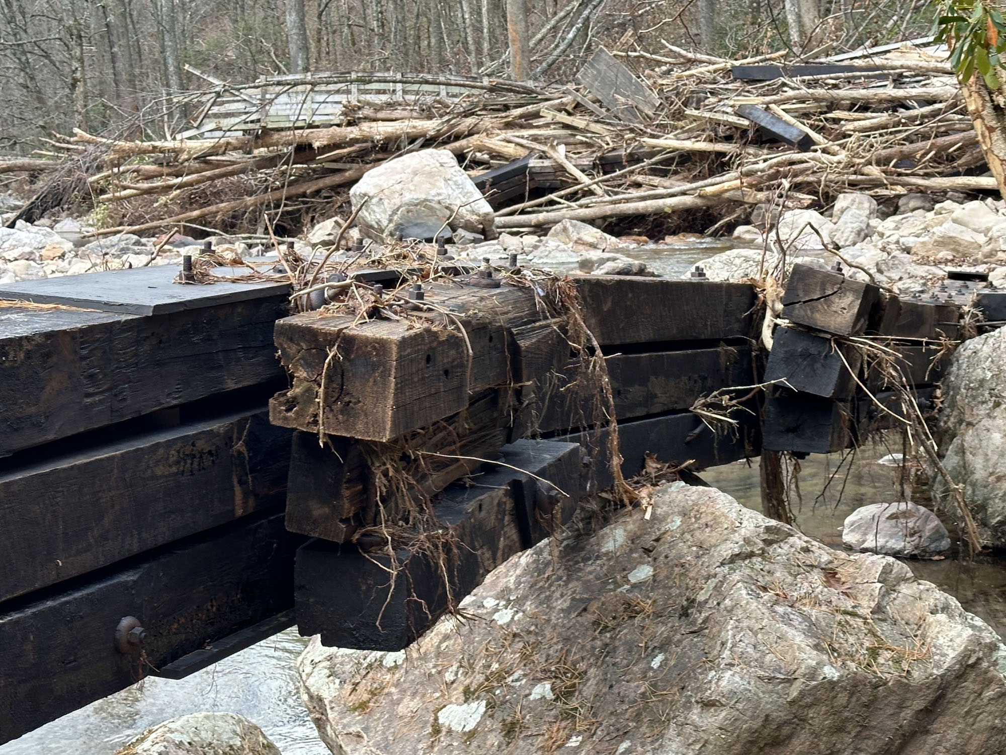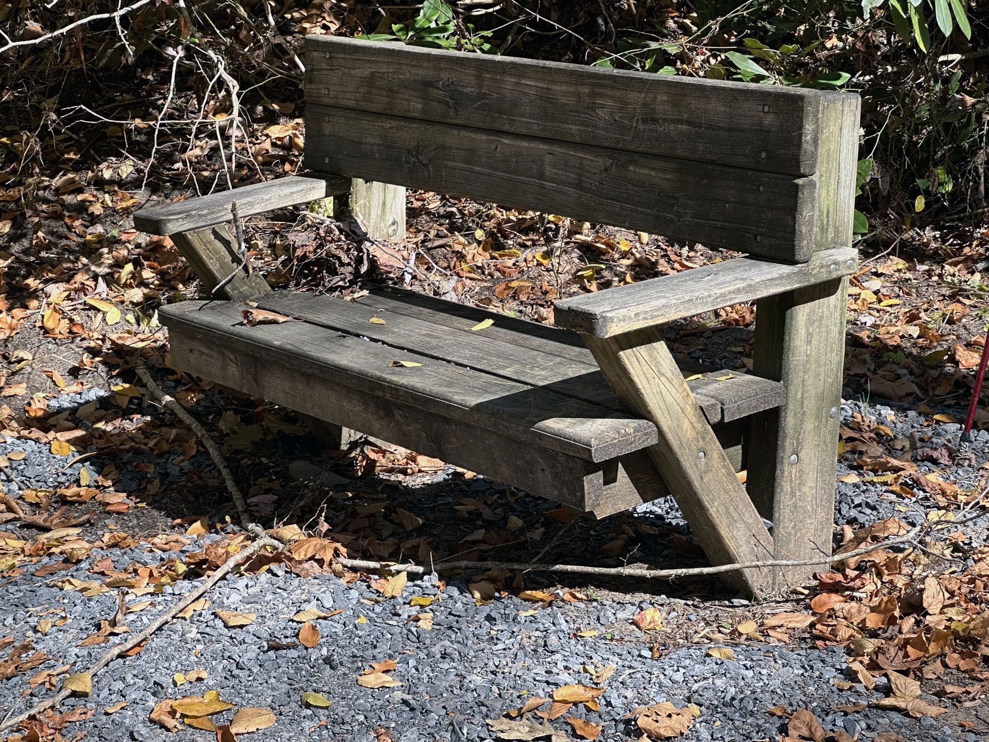 A lone bench sits near Trestle 22, one of the few survivors of Helene.