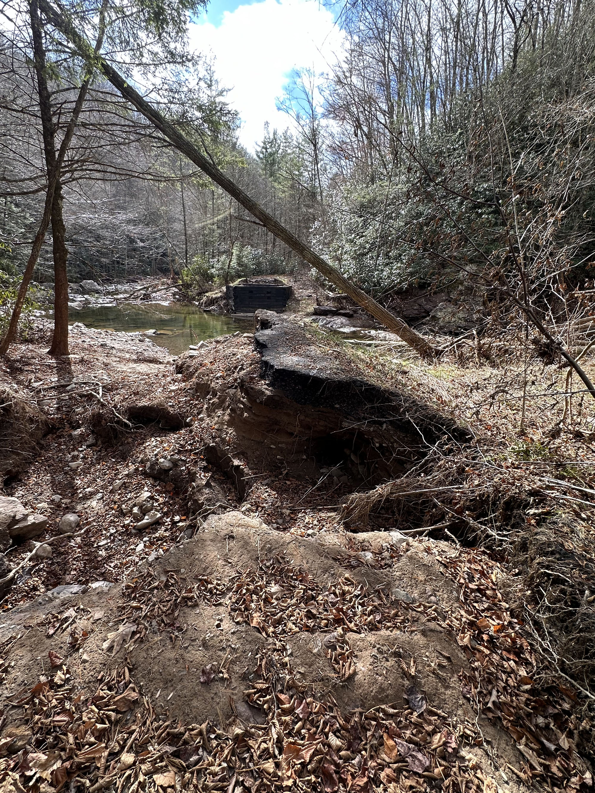 In a bend of Laurel Creek an intact section of a washed-away trestle forms the foundation of a new dam.