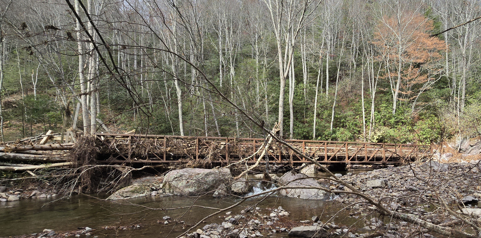 Yes. In sections of the trail the old railroad bed has simply disappeared. Rebuilding it would require construction within Laurel Creek.